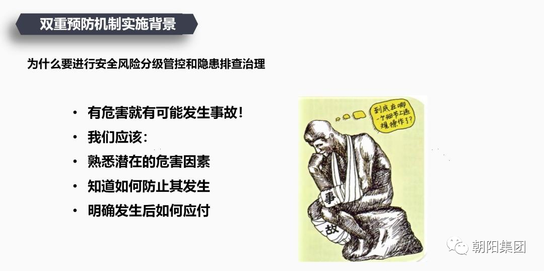 在培訓(xùn)活動中,朝陽集團申總詳細給員工講解了風(fēng)險分級管控、隱患排查治理的概念、方法和流程等,并強調(diào)了雙重預(yù)防機制在安全生產(chǎn)中的重要性。申總首先對雙重預(yù)防機制的定義進行了闡述,再對風(fēng)險分級管控與隱患排查治理的雙重預(yù)防機制進行了深入的講解。