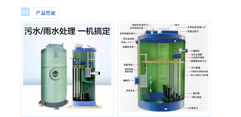 朝陽一體化預制泵站由筒體、提升設備、水泵機組系統、管路系統、控制系統、維護平臺、扶梯和底部板件等組件集成裝配而成。